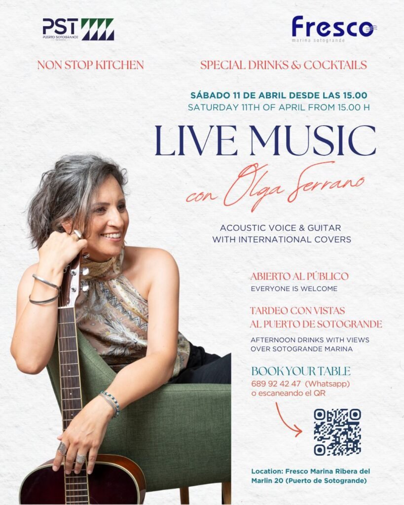 Este evento que organiza Fresco Marina Sotogrande y donde colabora Puerto Sotogrande, contará con la actuación de Olga Serrano en un formato musical de voz y guitarra acústica con versiones internacionales, y se desarrollará como una propuesta abierta al público en un entorno vinculado a la oferta gastronómica y de ocio de Puerto Sotogrande. El evento incorpora además una propuesta de non stop kitchen, así como una selección de special drinks & cocktails, en una jornada concebida para disfrutar de la música en directo y del ambiente del puerto.